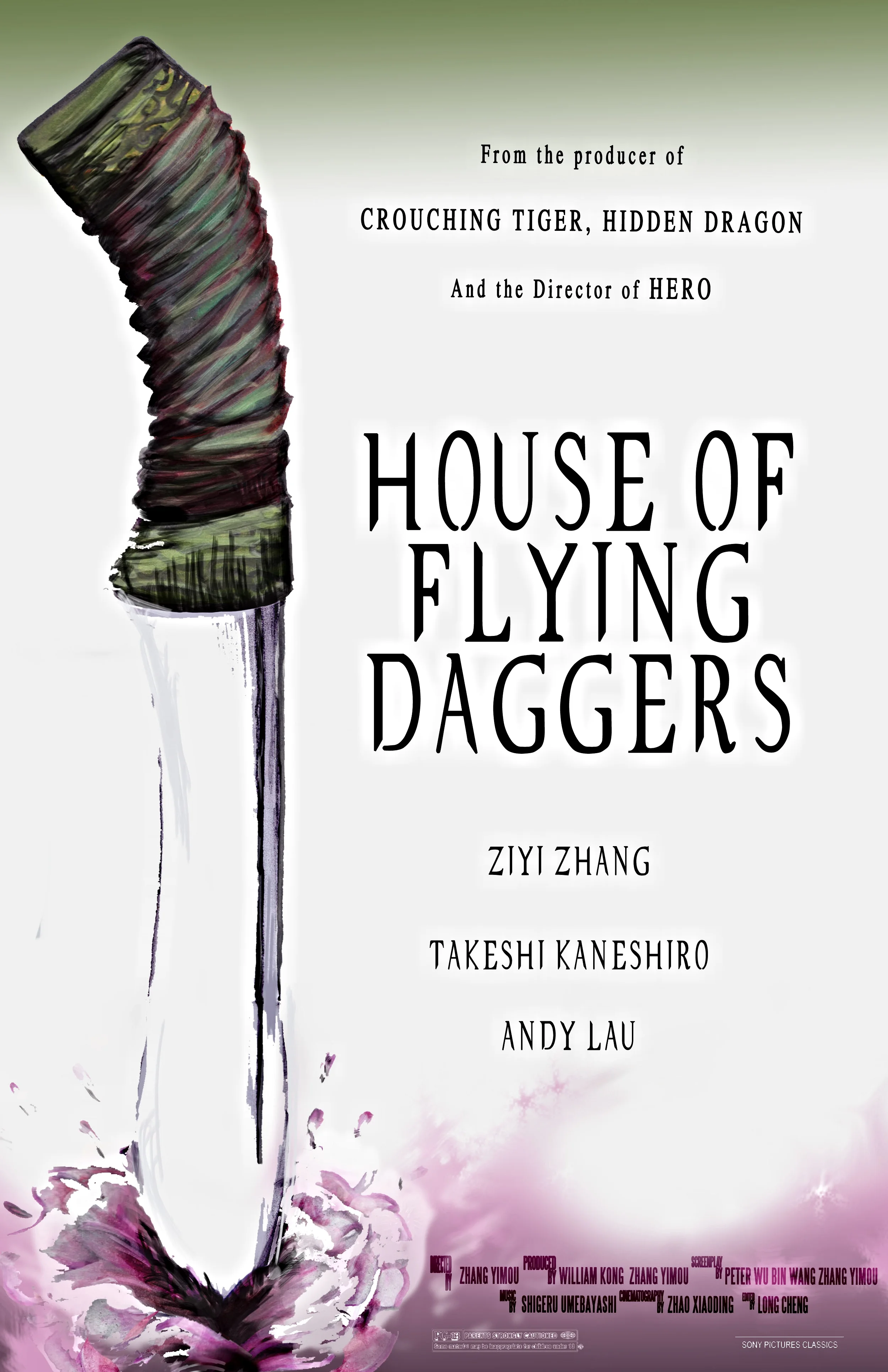 A tribute to the 2004 Action/Drama hit House of Flying Daggers. This movie poster design was inspired by the tragic love story of Xiao Mei (Zhang Ziyi), Jin (Takeshi Kaneshiro) and Leo (Andy Lau) during the Tang Dynasty.
