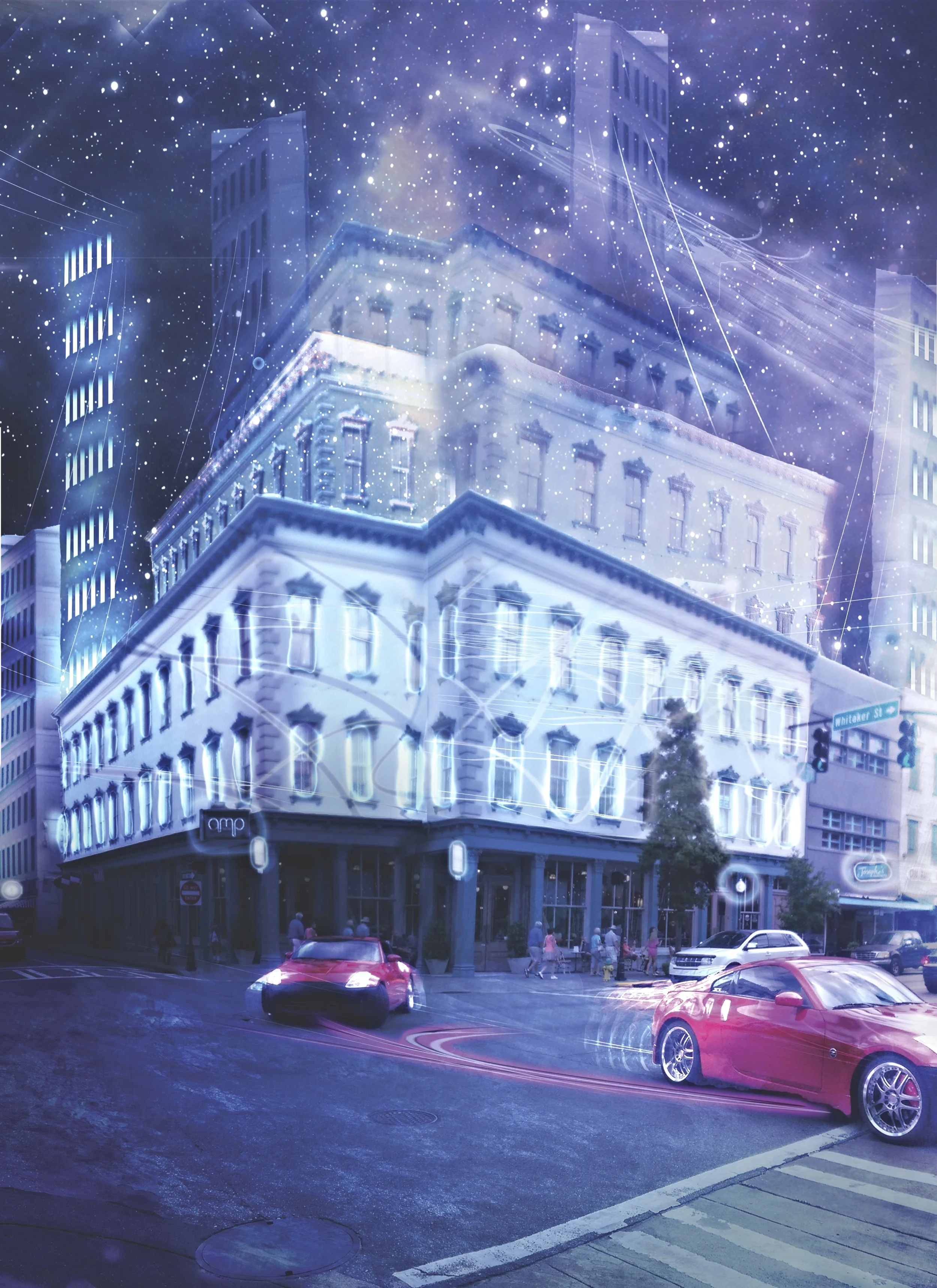 A Matte painting of downtown Broughton St. of Savannah, GA and the futuristic elements of a cyber world. This combination was created to bridge the historical charm of downtown Savannah with the futuristic technological landscape.